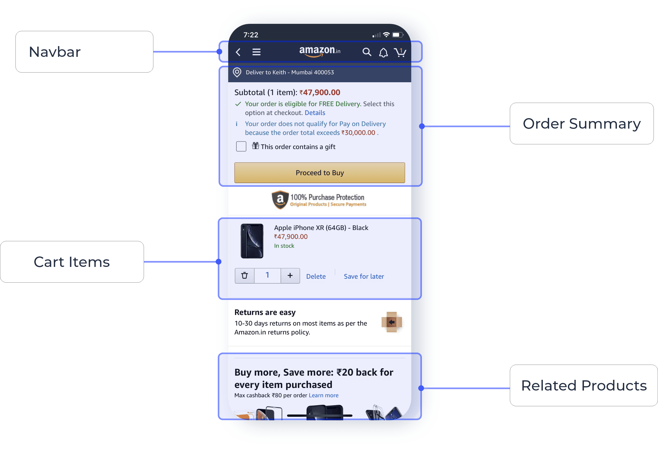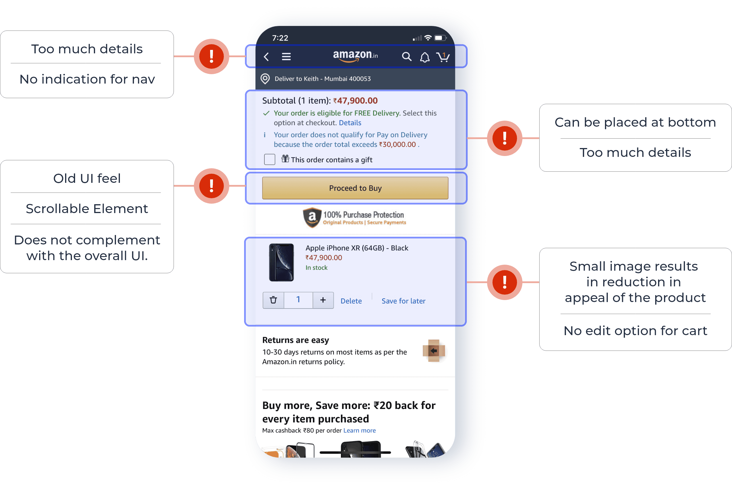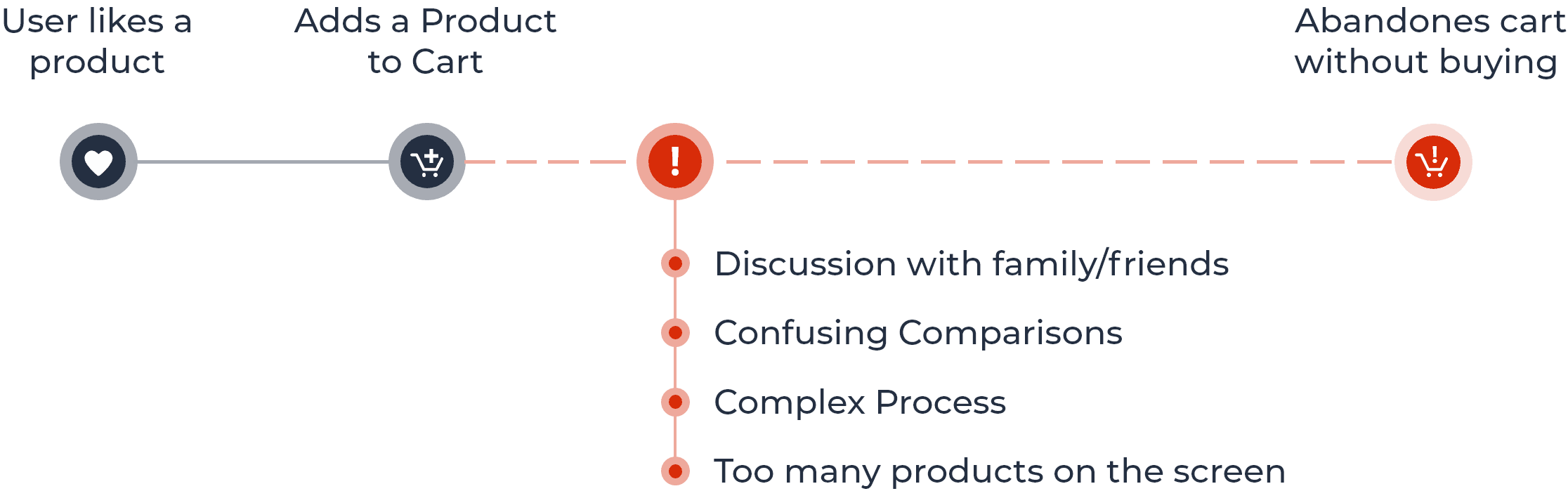 I conducted user interviews for the present UI and arrived with problems such as people saving items in the save for later lists and never buying them.
