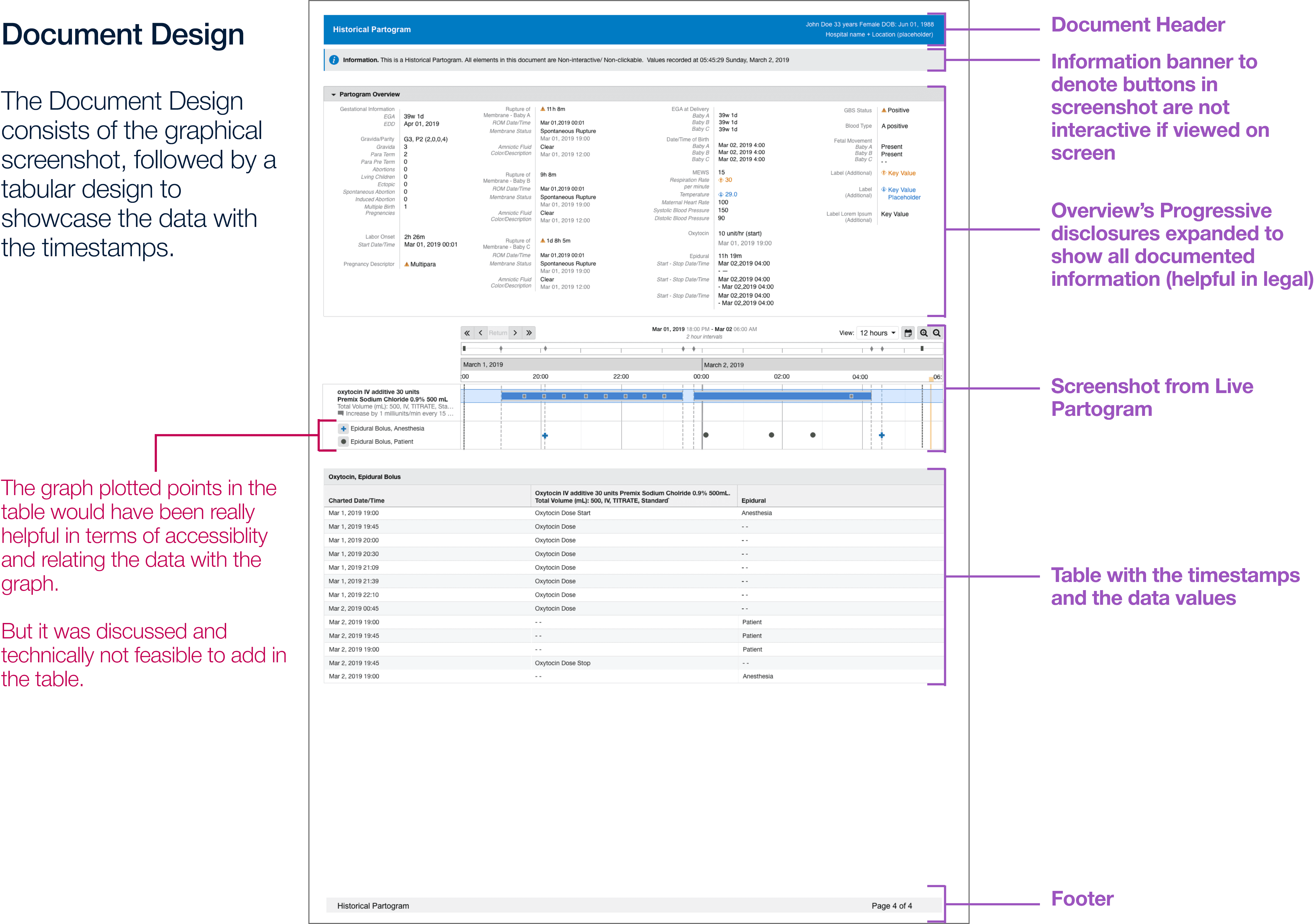 Product Team proposed a snapshot of the Partogram be taken at a specific point in time (Partogram Stop) and saved off as a document type. This document type should show the graphical and flowsheet information as it displayed to the clinician when the patient was in labor, and should not be interactive. For any relevant clinical information that is displayed in a side panel through user interaction on the live partogram, this information should be available supplementary to the graphs or flowsheets as needed. This can display next to or below each relevant graph.