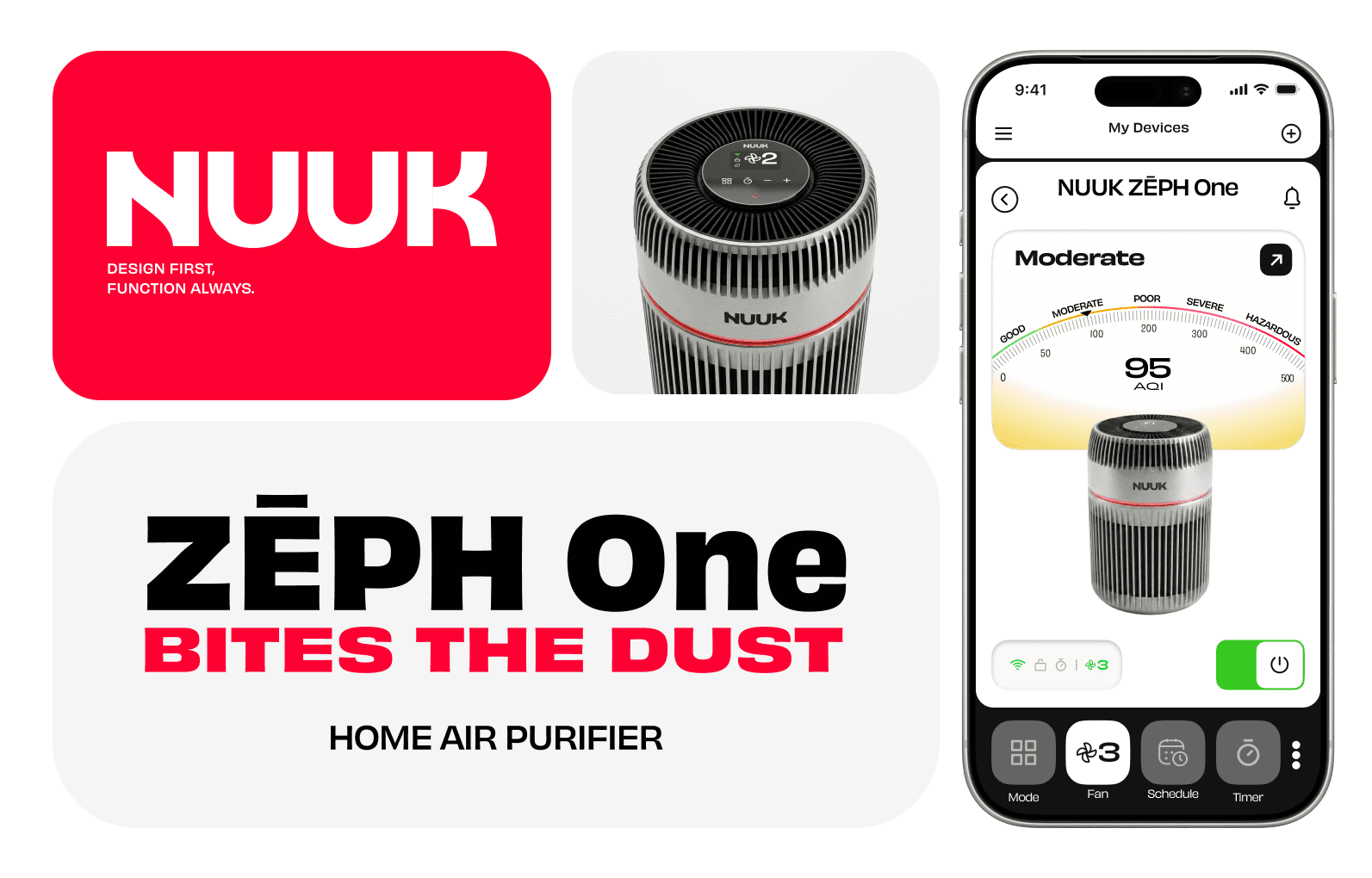 Beyond the UI, I developed the product name ZEPH One — derived from Zephyr, meaning a soft gentle wind — after studying NUUK's existing product lineup and brand conventions. The tagline "Bites the Dust" pushed the personality further, giving the product a voice that felt bold and characterful while staying true to NUUK's ethos. The device renders were also created by me using Gemini, giving the case study a complete product feel rather than a purely screen-based submission.